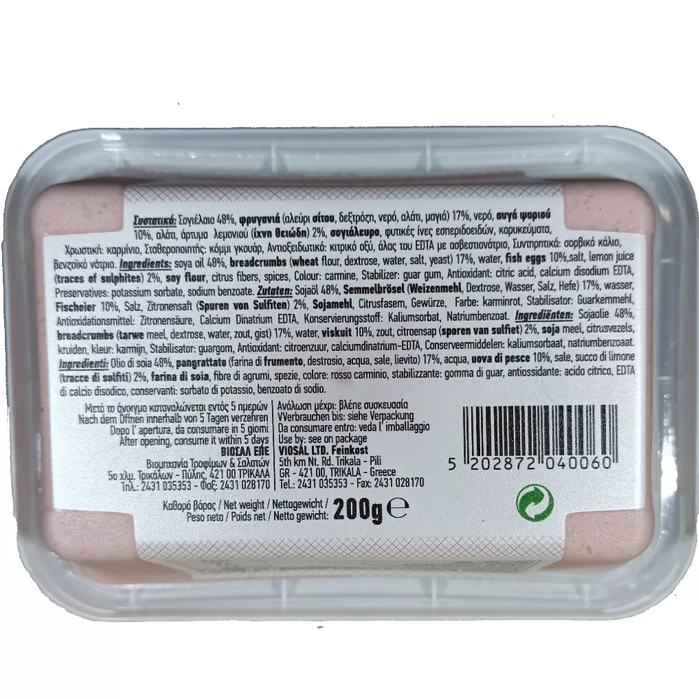 Biosal Taramo Salat Beim Taramo- Salat handelt es sich um ein griechisches Erfolgsrezept, das inzwischen weltweit bekannt ist. Dieses Salat-Produkt ist eher eine Fischpaste, die aus Tarama (gesalzener Fischrogen), sowie Brot und Gewürzen besteht. Diese Fischrogencreme, (griechisch Tarama), ist eine wirkliche Spezialität der griechischen Küche. Auf Basis von Fischrogen, Brot bzw. Kartoffelpüree und feinen Gewürzen, entsteht nach einer traditionellen Überlieferung eine köstlichen Creme. Bie Sie diesen servierfertigen Tarama als Appetithappen, auf einer Vorspeiseplatte (Mezé) oder als Salatdip zum Hauptgang an. Haltbarkeit (nach dem Öffnen): Vier Tage. Das Unternehmen Viosal zählt zu den führenden griechischen Anbietern im Bereich Feinkost. Die Erzeugnisse erfreuen sich nicht nur in Griechenland hoher Beliebtheit.