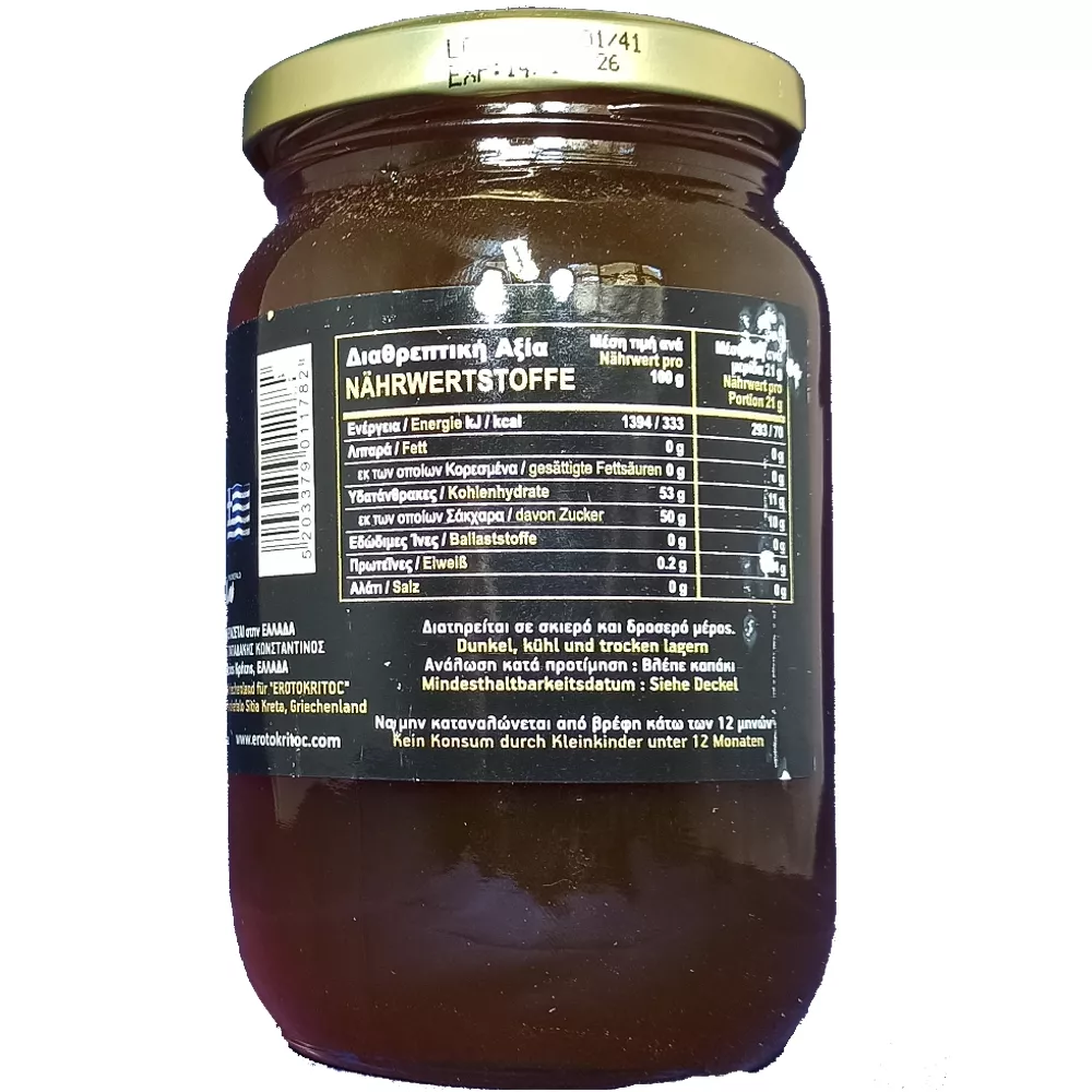 Erotokritoc - Griechischer Nadelbaum Blüten- Honig aus aus den Bergen Kretas. Erleben Sie den außergewöhnlichen Geschmack des Erotokritoc Nadelbaum-Blütenhonigs von der Insel Kreta. Dieser hochwertige 500g-Honig ist ein Zeugnis des natürlichen Reichtums Griechenlands, bezogen aus der malerischen Gegend von Piskokefalo Sitia in Kreta. Er besticht durch sein charakteristisches, kräftiges Aroma und seinen süßen, verwöhnenden Geschmack, der jede goldene Wabe zum Leben erweckt. Die authentische Qualität des Erotokritoc Nadelbaum-Blütenhonigs ist unübertroffen. Jeder Tropfen wird von erfahrenen Imkern mit jahrelanger Expertise und Hingabe geerntet. Die sorgfältige Auswahl der Blüten verleiht ihm eine ganz besondere Note, die sich in seinem tiefen, reichen Geschmack widerspiegelt. Genießen Sie diesen Honig als kulinarisches Highlight, das Ihre Kreationen auf ein neues Level hebt und entdecken Sie die Magie, die in jedem Glas steckt.