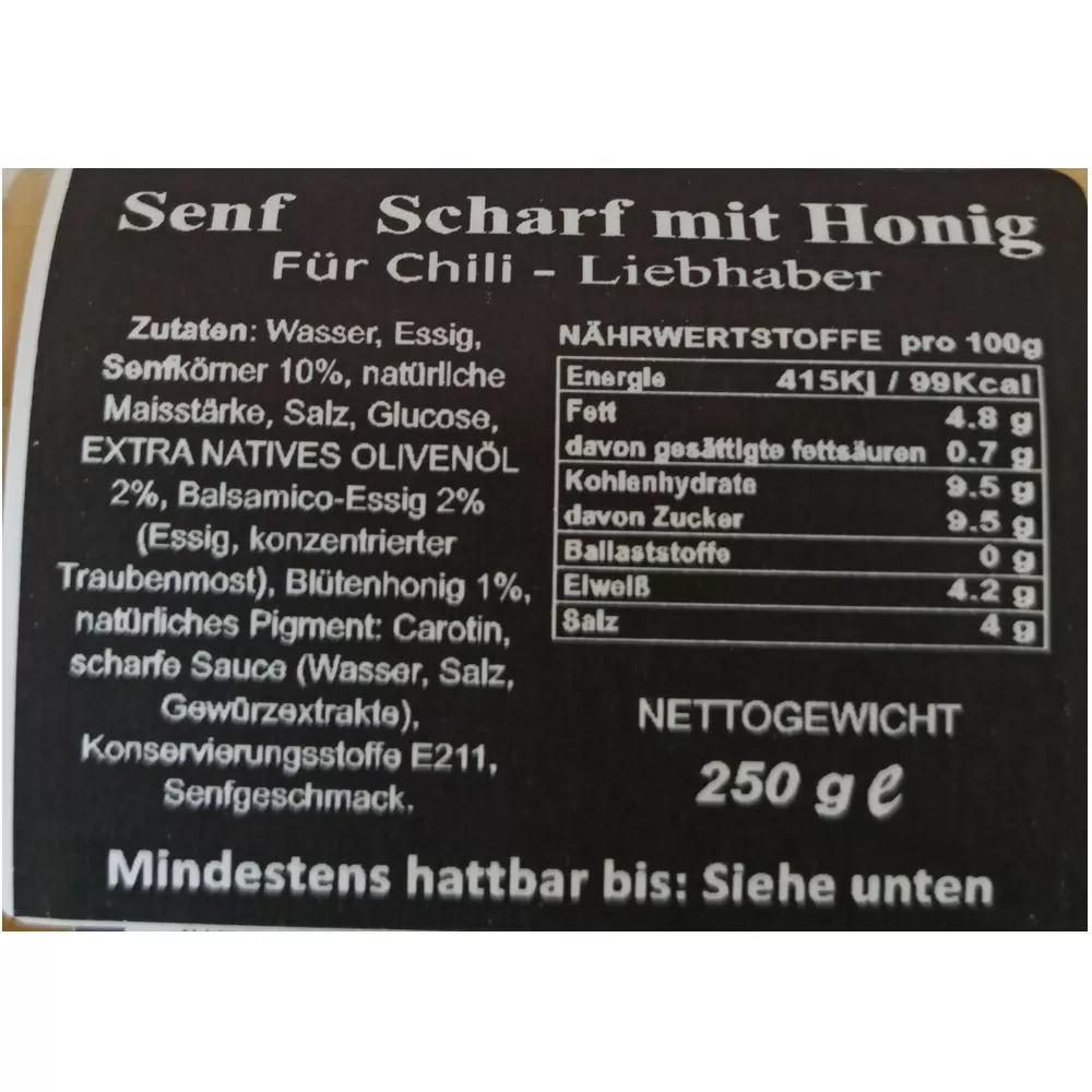 Inhaltsstoffe/ Zutaten: Senfkörner scharf, Wasser, natürliche Maisstärke, Salz, Glukose, extra natives Olivenöl, Blütenhonig, Balsamico- Essig