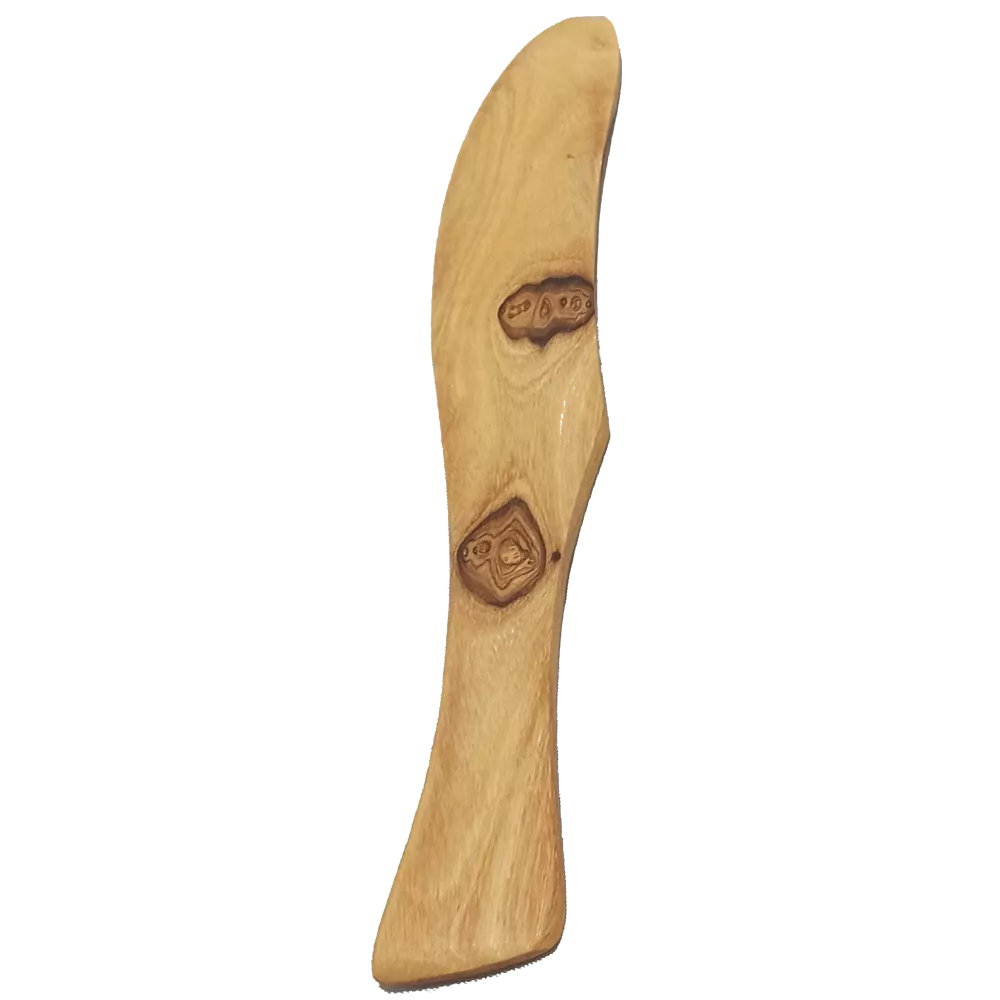 A beautifully crafted butter knife in natural tones of olive wood. Practical and with a peculiar look. Since the olive wood always has different growth, grain and color, each item is to be regarded as an individual piece or one-of-a-kind.