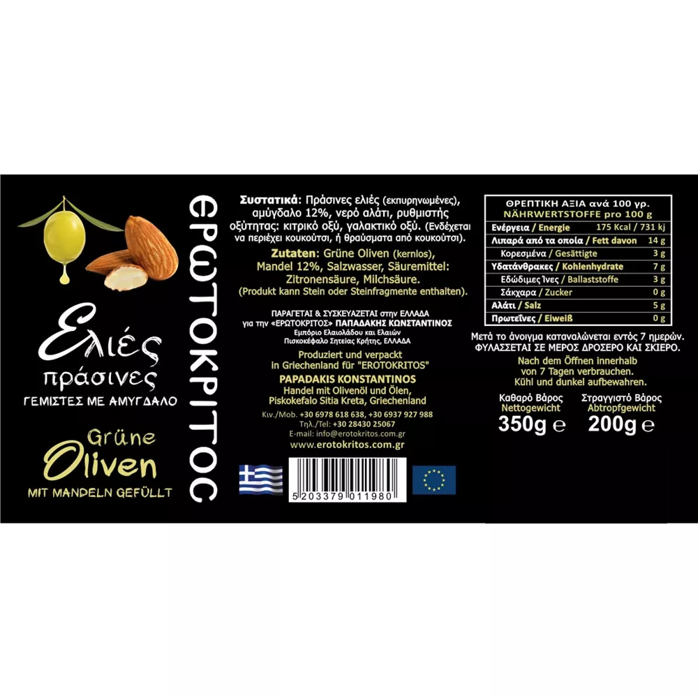 These olives filled with almonds are made by Papadakis Konstantinos / Erotokritos, the olive specialist from the Sitia region, Crete in Greece. Just like the olive oil, which has won several international awards, or the excellent organic certified olive oil, the filled olives are among the premium products of the Erotokritos company also.
