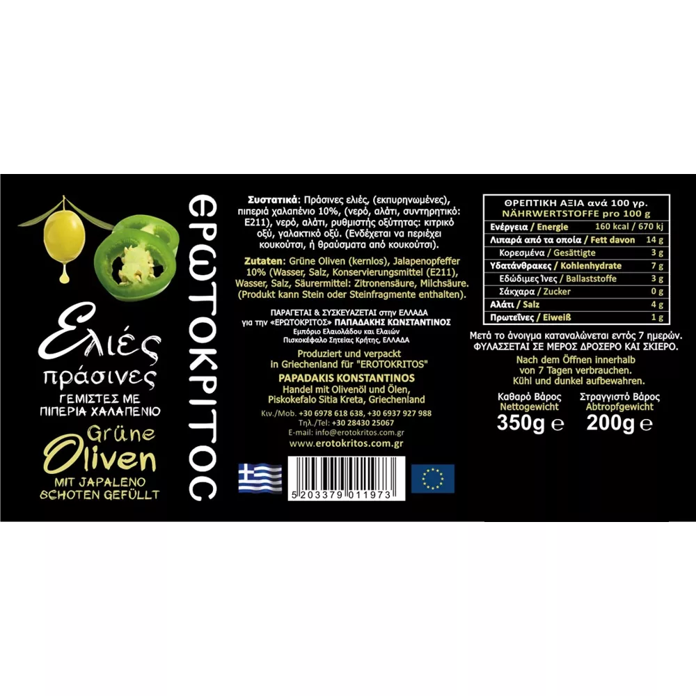 Green olives with jalapeno from Crete, (drained net weight: 200 g) Erotokritos