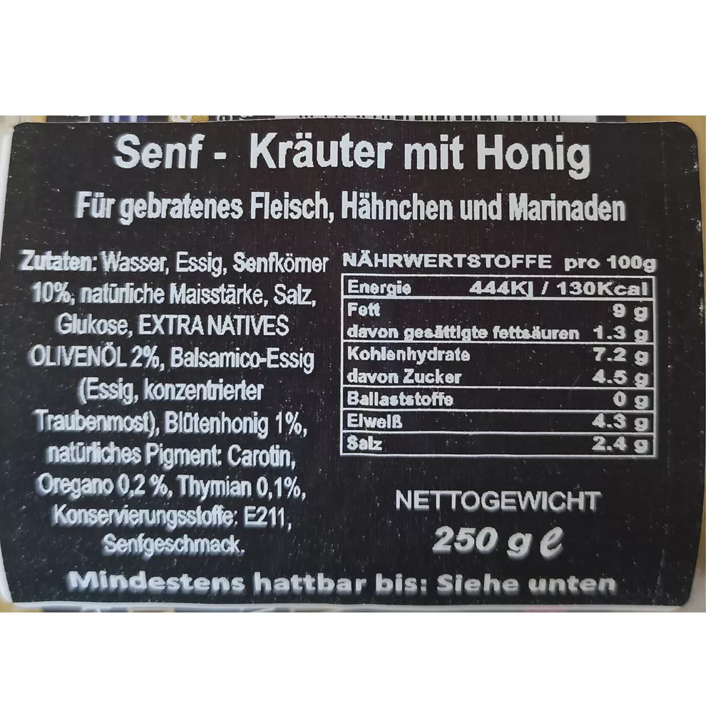 Mustard with thyme and oregano is particularly suitable for chicken, roasted meat and as an ingredient in marinades. Please store in a cool place after opening.