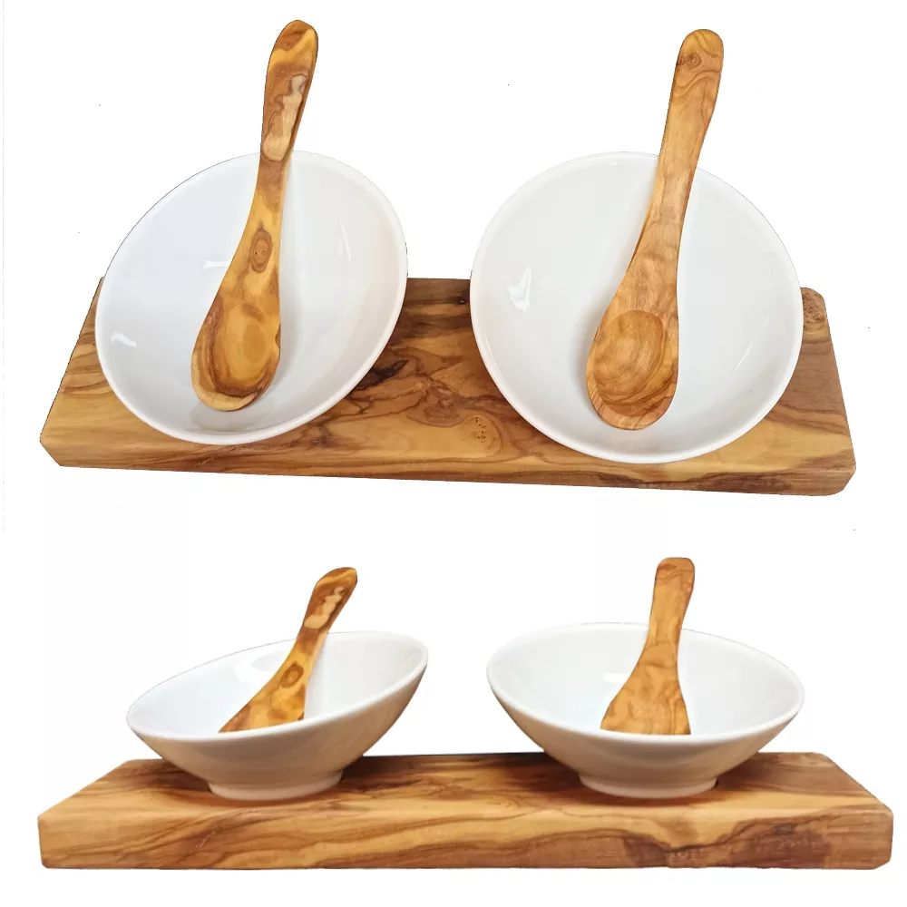 This decorative and very practical dip bowl set contains two slightly oval and slightly angled porcelain dip bowls and two spoons made of olive wood. The associated, simple but elegant base made of natural olive wood has two recesses that ensure that the dip bowls do not slip.