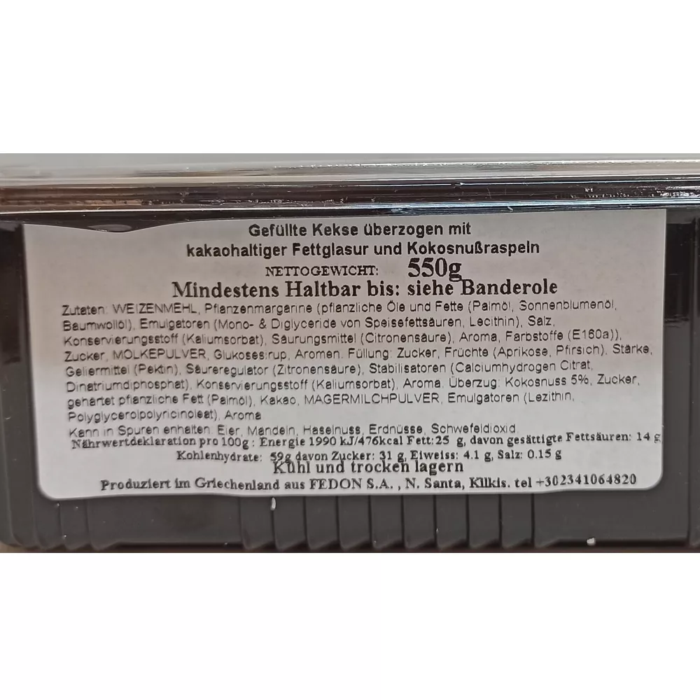 Inhaltsstoffe/ Zutaten: Weizenmehl, Pflanzenmargarine, Palmöl, Sonnenblumenöl, Baumwollöl, Lecithin, Salz, Zucker, Molkepulver, Glukosesirup, Konservierungsstoffe (Kaliumsorbat, Zitronensäure), Früchte (Aprikose, Pfirsich), Stärke, Aroma, Kokosnuss, Kakao, Magermilchpulver (Kann Spuren von Eiern, Mandeln, Erdnüssen, Nüssen, Schwefeldioxyd enthalten)